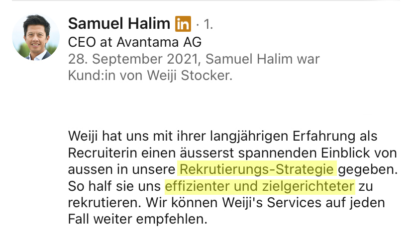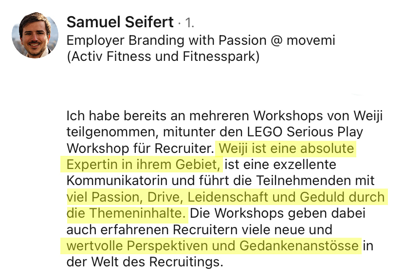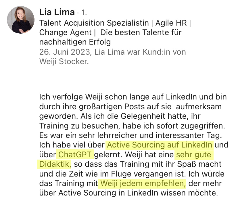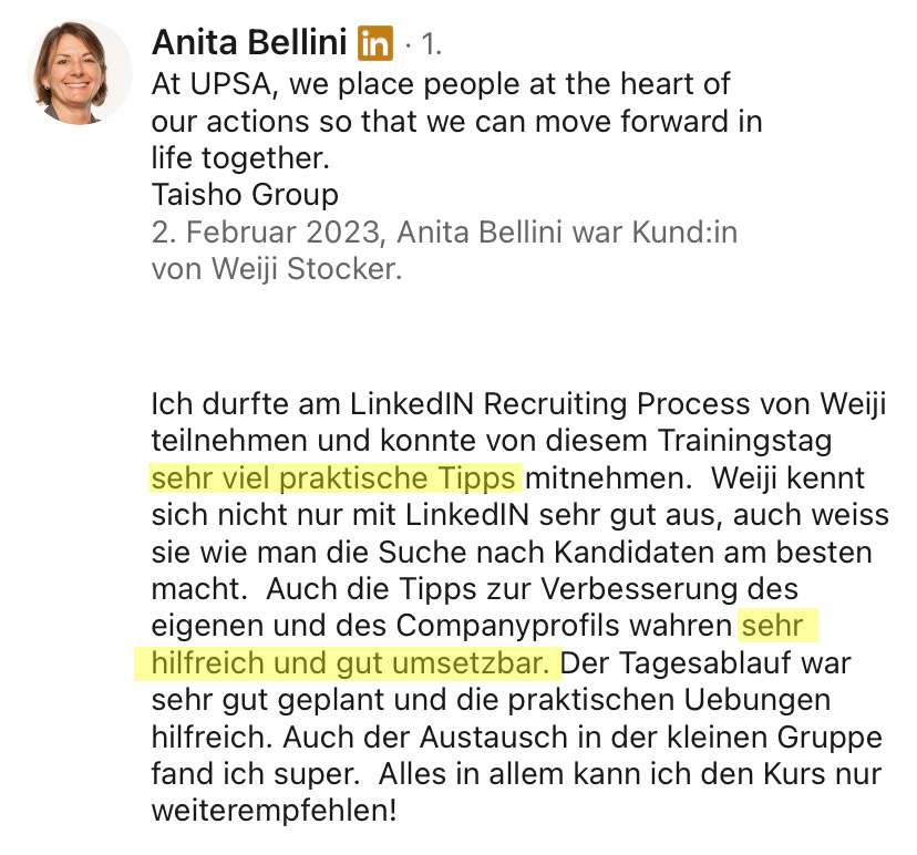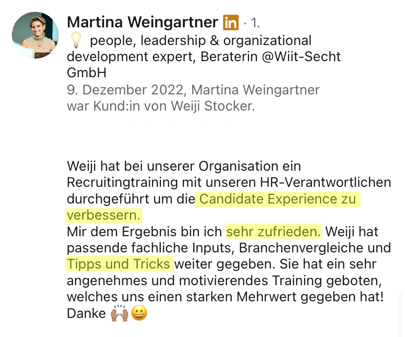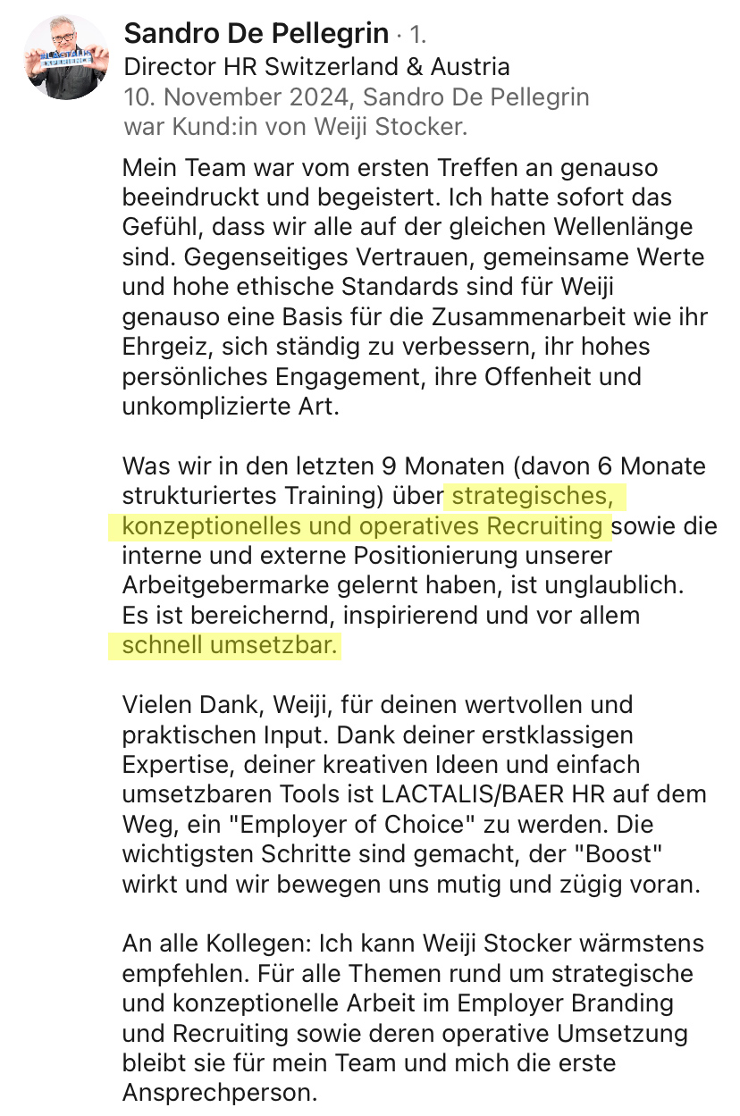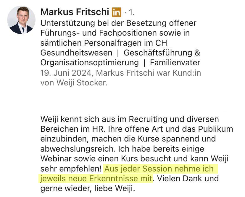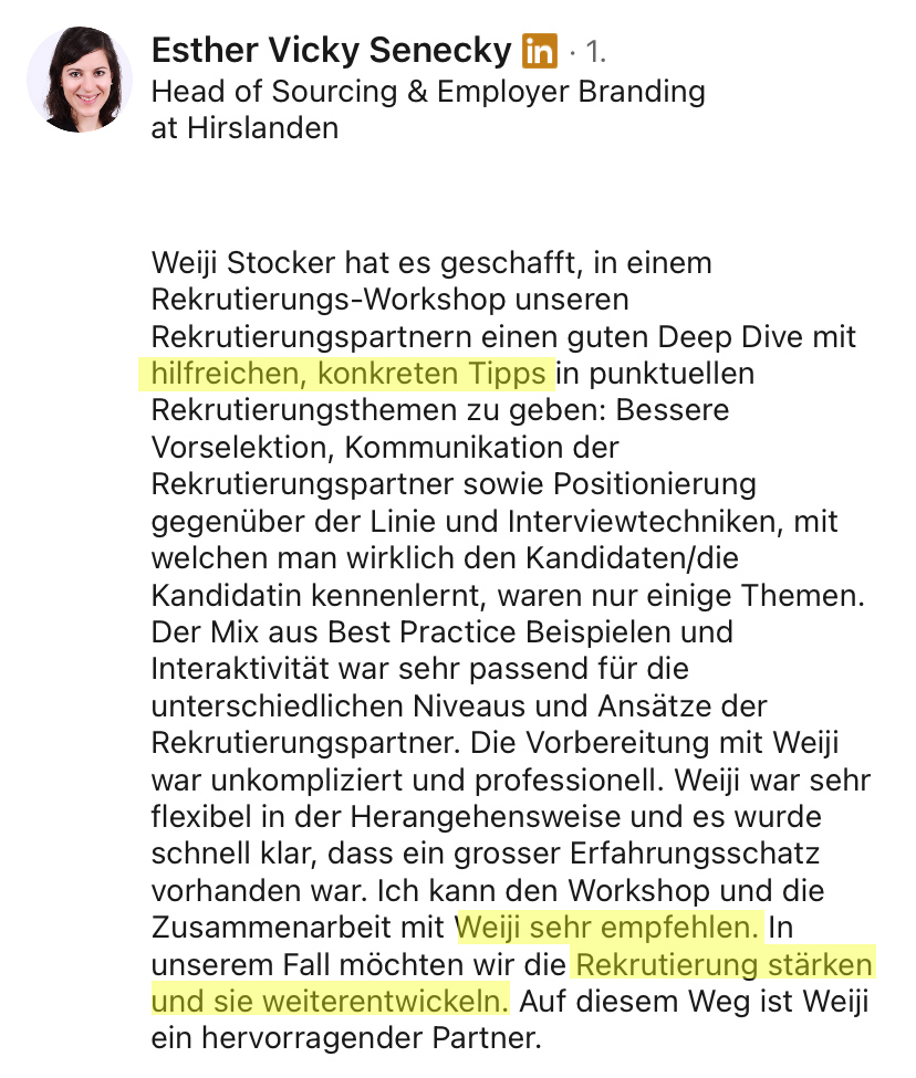 Ich habe über 500 Stellen besetzt, Millionen Menschen auf LinkedIn erreicht und mehr als 7’200 Teilnehmende in Online- und Offline-Trainings ausgebildet.